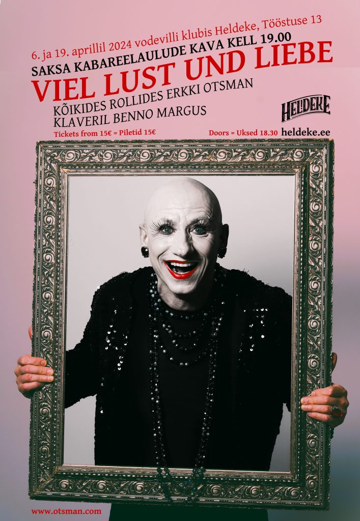 Homme, 6. aprillil ja 19. aprillil toimub Heldekeses Erkki Otsmani lustlik kabareelaulude kava “Viel Lust und Liebe”, kus rännatakse 1920-30 ndate Berliini.