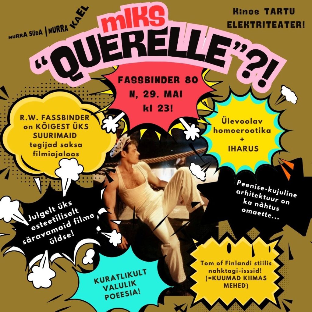 Saksa uue kino ja üldse kinoajaloo vaieldamatu suurkuju Rainer Werner Fassbinderi viimaseks jäänud film “Querelle” tuli välja vahetult pärast 37-aastase filmitegija traagilist surma 1982. aasta suvel ja on tänaseks omandanud LGBT-kultusfilmi staatuse. Kino Tartu Elektriteater toob omakorda selle kirest lõõmava filmikunsti pärli ekraanile Fassbinderi 80. sünniaastapäeva tähistamiseks. Ühtlasi on film sujuvaks sissejuhatuseks seansile peagi järgneva Pride’i kuu auks!
