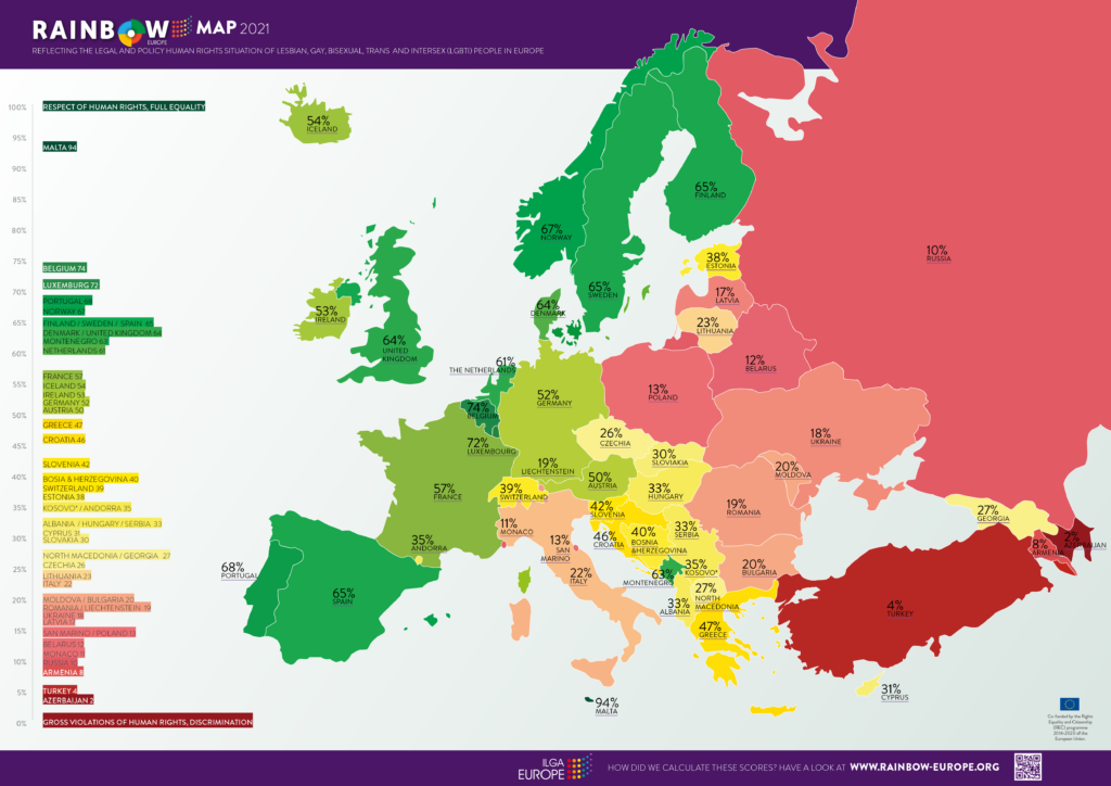 Iga-aastased Rainbow Europe kaart ja indeks, mille ILGA-Europe avaldab 17. mail, näitavad LGBTI inimeste õiguslikku olukorda 49 Euroopa riigis. Ülevaatest selgub, et viimase kaheteistkümne kuu jooksul pole riigid LGBTI inimeste õiguste parandamiseks teinud peaaegu ühtegi sammu. Kaardi avaldamise 12-aastase ajaloo jooksul on see erakordne. Mõnes riigis on siiski käsil eelnõud ja tegevusplaanid, mis annavad lootust, et aasta pärast näeb kaart teistsugune välja.